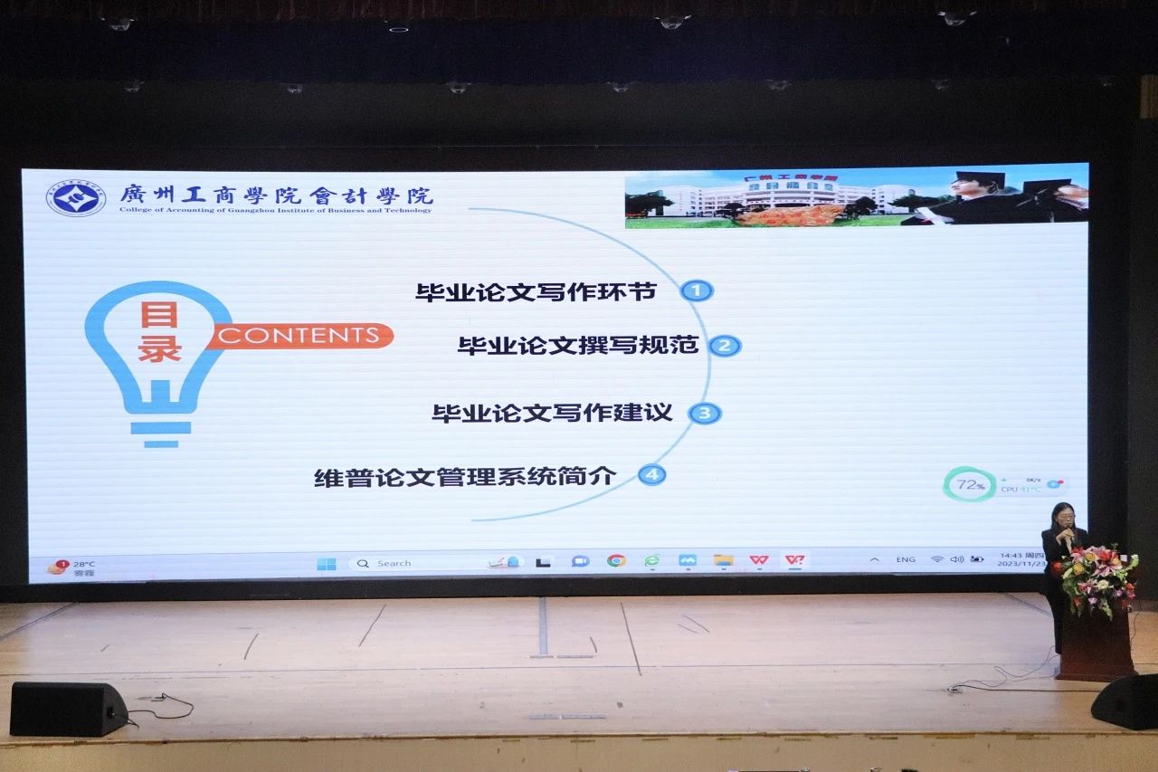 主讲人高少慧老师主要以写作环节、撰写规范、写作建议以及维普论文管理系统简介进行讲述。首先,她指明毕业论文的写作主要围绕选题、开题、初稿、中期检查及定稿、论文检测、成绩评定及交叉评阅、答辩、归档八个环节进行;其次是论文撰写的规范,尤其是中英文摘要+关键字、目录、论文正文、参考文献等内容的撰写方法和要求;最后介绍了维普论文管理系统,包括系统的信息管理、选题管理、过程管理以及指导学生如何进行登陆等相关信息。