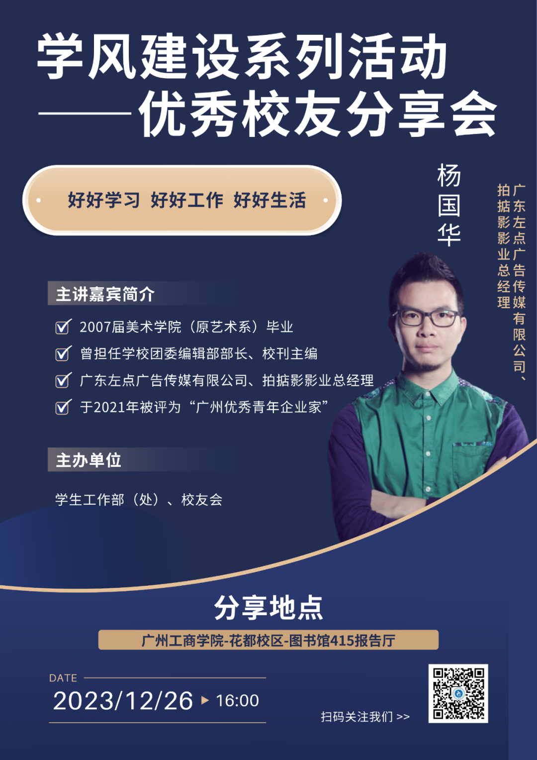 为更好地让同学们树立奋斗目标、明确发展方向、激发学习动力,学生工作部(处)创新学风建设的新思路、新举措,联合校友会举行学风建设系列活动之优秀校友分享会。本期分享邀请到的优秀校友是:ky开元集团官网创新创业导师、ky开元集团官网佛山校友会会长、广东左点广告传媒有限公司、拍掂影影业总经理——杨国华。