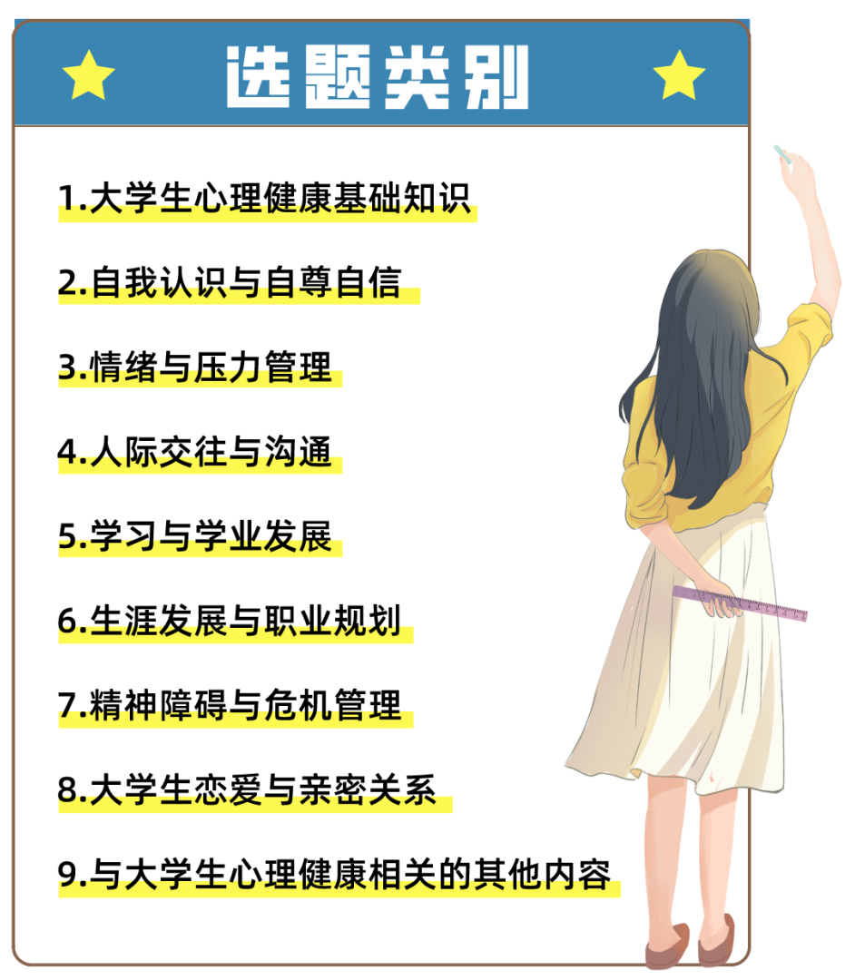 选题方向应从《全国大学生心理健康教育微课征集展示选题类别》(附件1)中确定,可在相应类别下细化具体内容,精心进行教学设计、课程讲授、视频制作,形成与大学生学习生活密切相关的心理健康教育微课。
