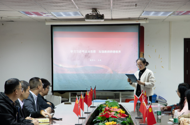 学生处党支部在学生活动中心209会议室召开专题学习会,本次学习专题为《深入学习领会习近平法治思想》,由学生处党支部宣传委员王荣老师主讲,支部书记孙洪波主持,支部全体党员参加。