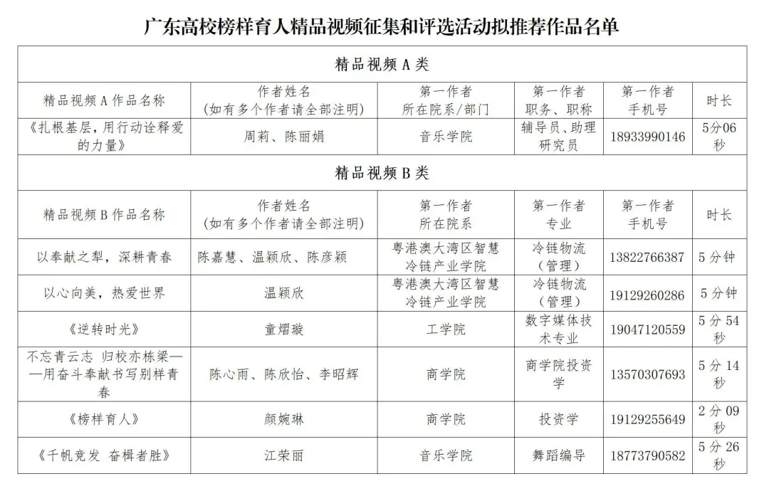 根据《关于开展广东高校榜样育人精品视频征集和评选活动的通知》相关要求,学校开展校内作品征集活动,经学生工作部(处)审核,推荐7件作品参加广东高校榜样育人精品视频征集和评选活动,现将名单予以公示。