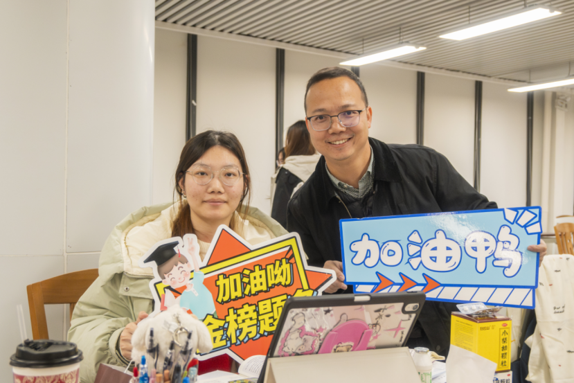 用爱护航,做学生的“守护者”。为鼓励考研学子蟾宫折桂,传递温暖与力量,学生工作部老师及融媒体中心学生干部在图书馆考研自习室为考研学子送上“考研加油袋”,鼓励同学们坚定信念、科学备考、劳逸结合,以良好的状态迎接考试,全力以赴地跑完“最后一公里”。
