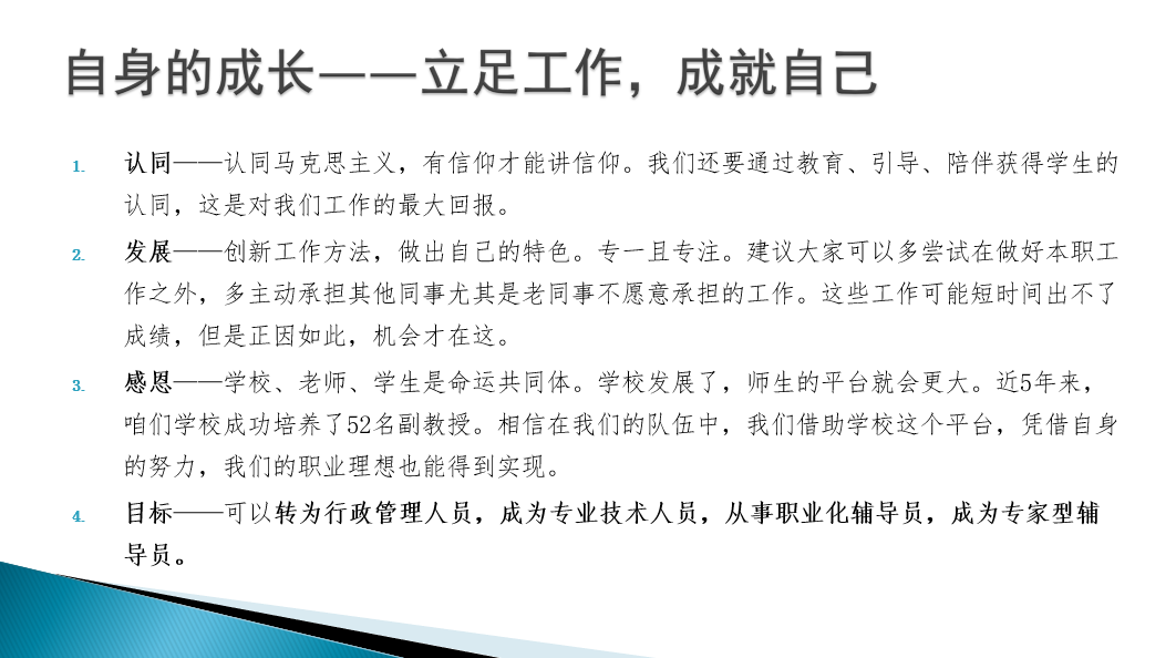 毛拓艺老师分享了辅导员工作开展的方法,比如团中央的“三走”---走下网络、走出宿舍、走向操场;工作开展要融入三全育人——全员、全方位、全过程;四个关键词分享了自己对辅导员发展的想法——“认同、发展、感恩和目标”。