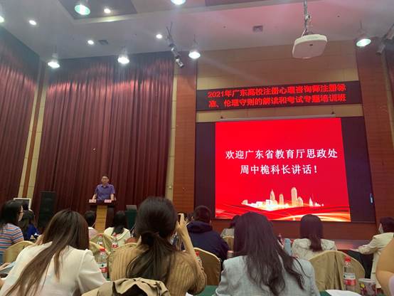 本次培训旨在向参加者传达《广东省高校心理咨询师注册标准》、《广东省高校心理健康服务人员伦理守则》(试行)等文件精神,提升参与者在学生心理健康教育工作方面的专业度与胜任力。广东省教育厅思想政治工作与宣传处科长周中栀在开幕式中说明了目前高校心理工作面临的形势变化,强调了本次培训的目的、意义以及省教育厅对高校心理健康教育工作的重视。