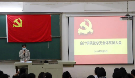 为贯彻落实习近平总书记在庆祝中国共产党成立100周年大会重要讲话精神和党史学习教育动员大会上的重要讲话精神,总结会计学院党总支上一年党史学习教育成效,推动各党支部继续深化党史学习教育,9月9日,会计学院党总支在第二实验楼C205召开全体党员大会。会议由会计学院党总支组织委员王萌同志主持。