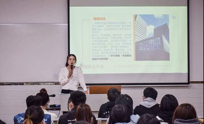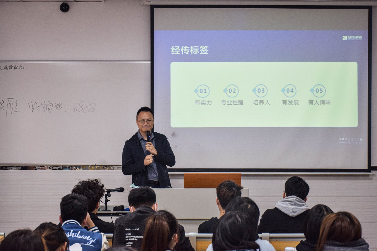 接着,广州经传多赢投资公司负责人向我们介绍了本公司的涉及领域、行业成就以及与学院专业的密切性,与同学们详细地分享了本公司的工作理念、团队精神和福利待遇。