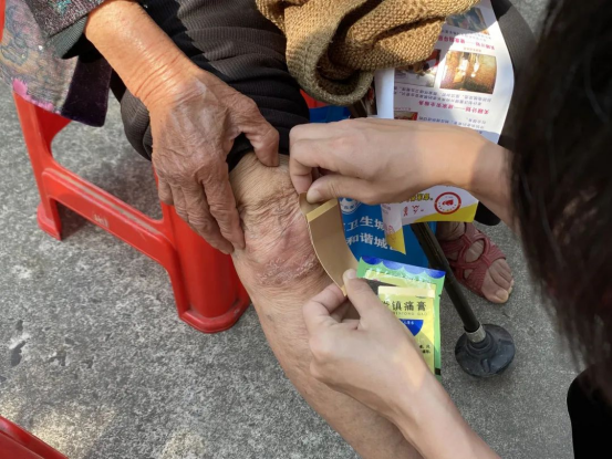 春晖社工为长者测量血压、贴药膏,学生志愿者关注长者身体状况