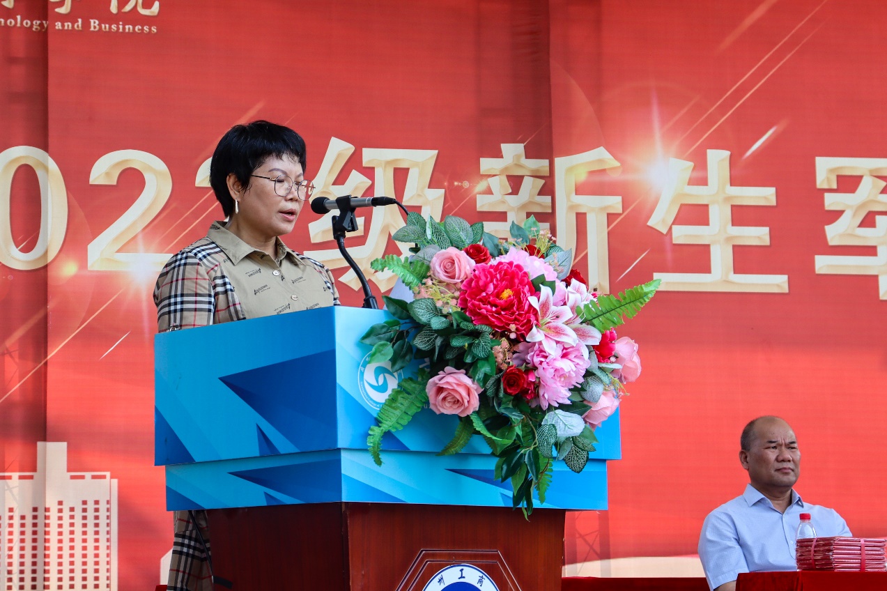 美术学院2022级视觉设计专业何晓琳同学作为新生代表致辞。她表示,在这十几天里,感受最多的是艰辛和疲劳,但却在军训中学会了勇敢面对一切困难,学会了挑战自我和超越自我。在今后的学习中,也要不忘初心、牢记使命,不断向着目标迈进,把自己培养成一个德学兼备的应用型人才。
