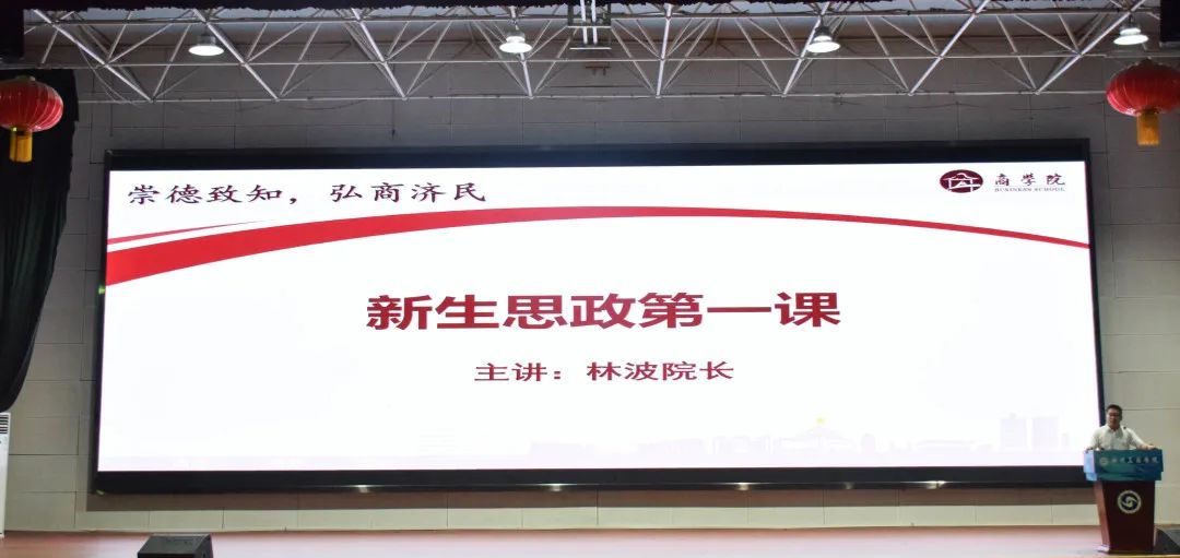 奏唱国歌结束后,由商学院党总支书记,学院院长林波博士为新生进行思政第一课暨德育教育。
