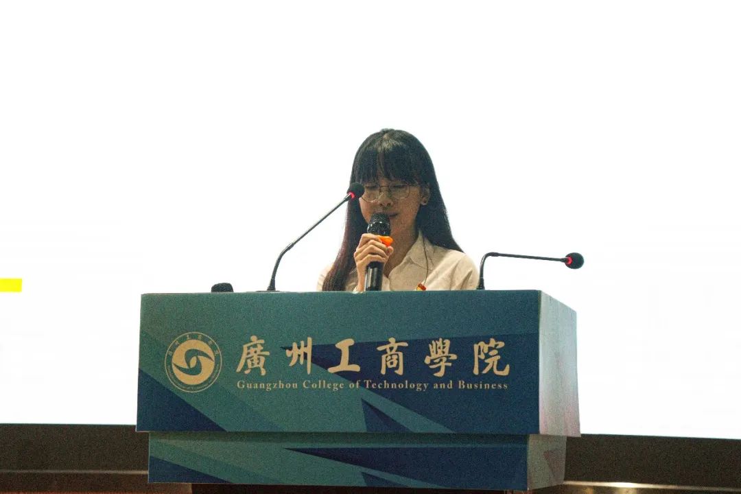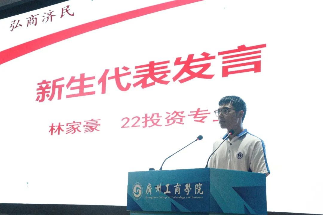 在老生代表发言后,作为大一新生的代表林家豪同学表示,我们刚跨入大学,要相信一切都是最好的安排,站在广工商的新舞台上,我们应以新的风貌去开启新的征程,博览群书,开拓视野,勇于尝试,强身健体。