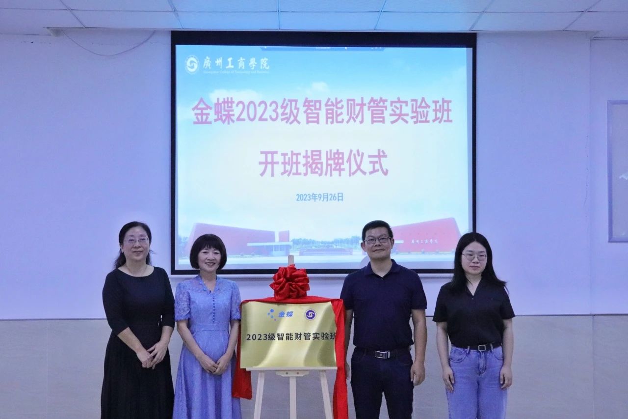 金蝶精一信息科技服务有限公司华南区总监魏佳丹先生、学校高级顾问易露霞教授、会计学院院长任道纹教授共同为2023级智能财管实验班揭牌,标志着2023级智能财管实验班顺利开班。