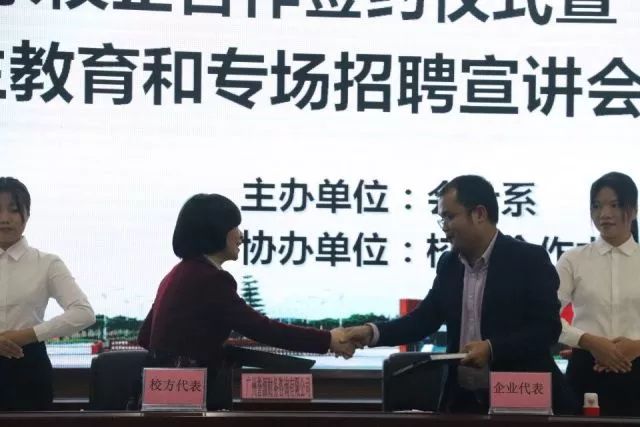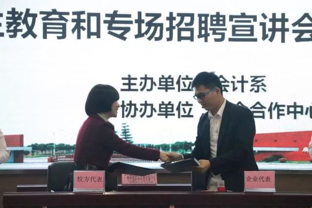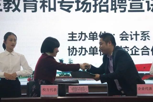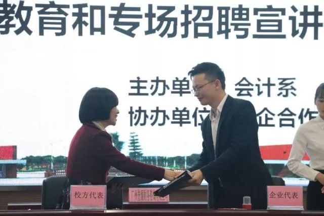 合作与发展,始终是时代前进的主题。12月7日下午两点,由会计系主办、校企合作中心协办的会计系校企合作签约仪式暨毕业生教育和专场招聘宣讲会在我院学生活动中心六楼举行。出席本次会议的领导与嘉宾分别有:我院副院长易露霞教授,广州誉源财务咨询有限公司总经理程谨源先生,广州聚恩财税咨询有限公司总经理杜晓峰先生,广州穗安财务咨询有限公司总经理王连广先生,广州祥佳财务咨询有限公司总经理汪松林先生,广州恒脉企业管理有限公司总经理黎荣毅先生,广州万顺财务有限公司总经理曾凡主先生,广州致圣财税代理有限公司联合创始人蒋雁先生,广东金账本会计咨询服务有限公司增值部总监赵远亮先生,广州优业财务咨询有限公司佛山分公司总经理刘雄先生,广州鸿顺财务咨询有限公司总经理黄有吟先生,广州蓝翔财务咨询有限公司总经理徐雅翔先生,广州四柱清财务咨询有限公司办公室主任许兆麟先生,我院三水校区管委会何国林主任,科研处处长、校企合作中心主任陈小康教授,会计系主任程燕教授,就业指导中心鲁江旭副主任,校企合作中心林启德副主任,会计系全桂艳副主任。