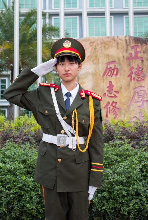 在学习上,她喜欢通过参加专业类的比赛来了解自己对知识的掌握程度,并从中收获匪浅。今年,她和队友们代表我院参加了第一届“百校百题”应用型创新课题大赛。而在课外,她于大一时加入了国旗护卫队,成为了一名旗手。每天下课后,她都风雨无阻地去参加训练。正步,齐步,走方阵,扛旗……即使辛苦,出于一颗执着的心,她从不言弃。说起第一次穿着军装站在国旗下的心情时,她表示依旧感到很激动。那一刻,所有的付出都有了回报!