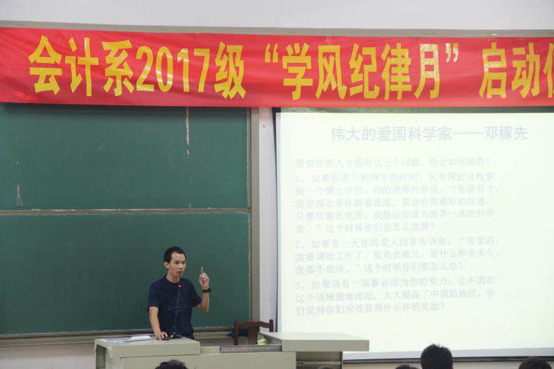 为了进一步加强学风建设,强化纪律,培养学生勤奋刻苦的学习态度,严谨求实的科学精神,同时营造良好的学习环境和育人氛围,会计系“17级学风纪律月”启动仪式于2017年10月30日晚上7点在第二实验大楼c205教室召开。我系副主任全桂艳,学工组组长毛拓艺,副组长苏建贤,17级全体辅导员及17级各班委参加了本次仪式。仪式由周敏老师主持。