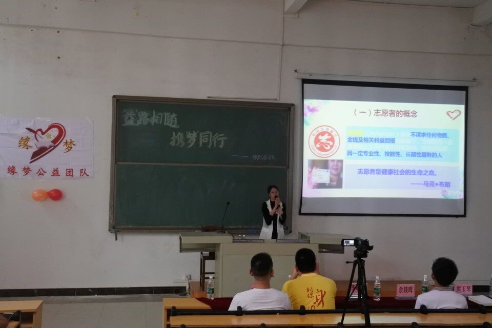 下午三时,活动正式开始。首先,缘梦的代表干事向大家介绍了团队各部门的职责和部门的特色活动。随后,由余燚晖老师进行发言。他在发言中提到两点:第一,做志愿者要有责任心,能力越大,责任越大;第二,做志愿者要善于管理自己的时间才能助人自助。同时,他也向在座的志愿者分享了一些志愿服务经验,令大家受益匪浅,感悟良多。