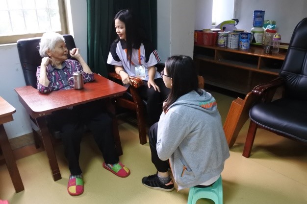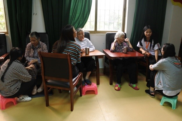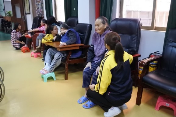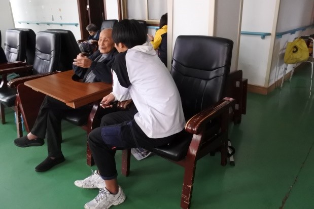 伴随着一丝细雨,同学们有组织、有纪律地前往皓辉敬老院。穿街过巷后,我们到达了目的地,敬老院负责人高兴地将我们迎进了敬老院。在双方接洽之后,同学们到老人寝室和活动厅中与老人们面对面聊天。在聊天的过程中,同学们询问着老人们近来的身体状况,并与他们讨论一些生活健康小知识和保健手法。老人们也向同学们讲述了他们年轻时候的事情,每当这时,同学们便会握住老人的手,静静坐在他们的跟前,认真聆听他们的故事。
