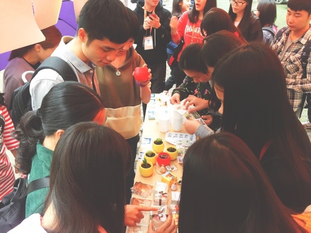 下午四时许,活动正式开始。伴随着绵绵春雨,缘梦团队的成员们早早布置好现场,摆放好精美礼品。有可爱的杯子、温馨的多肉植物、迷你香皂、精美的金属书签等等。同学们经过的时候,忍不住停下脚步看看,不一会儿,现场便聚满了人。同学们满怀热情地奉献出自己的一份爱心。通过爱心义卖小礼品,同学们互相传递彼此的温暖,弘扬了雷锋助人为乐的精神。