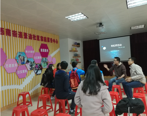 2017年3月11日,缘梦公益团队的指导老师和队员一起到校外志愿服务合作单位三水西南张边社区家庭服务中心组织开展“淼童·彩虹桥”阳光少年成长营开班仪式暨团建活动。