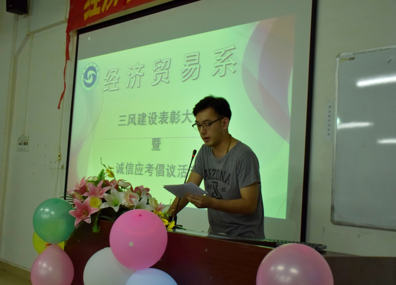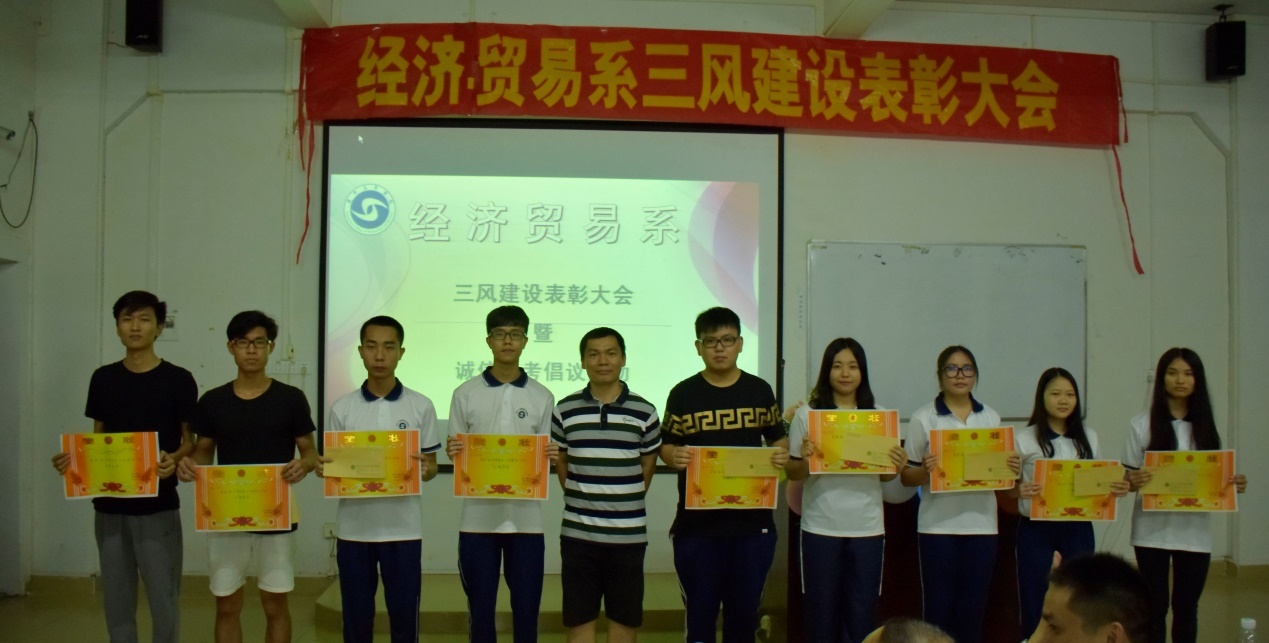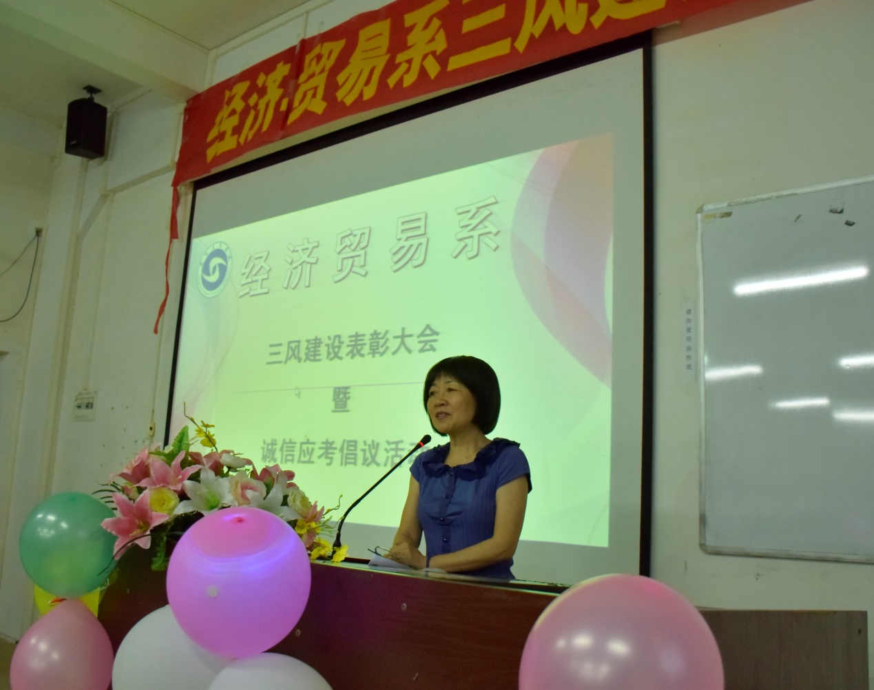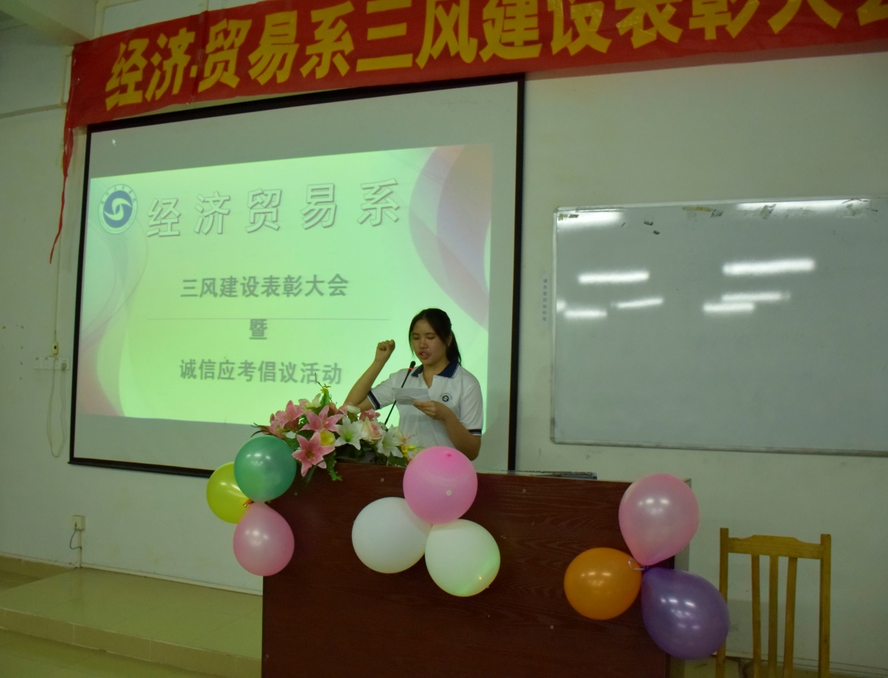 为了实践“以德为行,以学为上”的教育思想,倡导“五进”活动,进一步加强我系的校风、教风、学风建设,提高教育教学和人才培养质量,促进我系良好学风的形成,我系于6月15日晚19:00在经管楼101举办了本学期经贸系三风建设表彰大会暨诚信应考倡议活动。出席本次大会的有经贸系主任易露霞系教授、副主任李习纯副教授、副主任马超平老师、办公室主任黄享政老师和学工组的辅导员以及本学期获得先进班集体和文明宿舍的代表们。