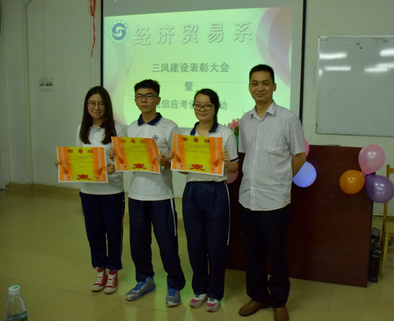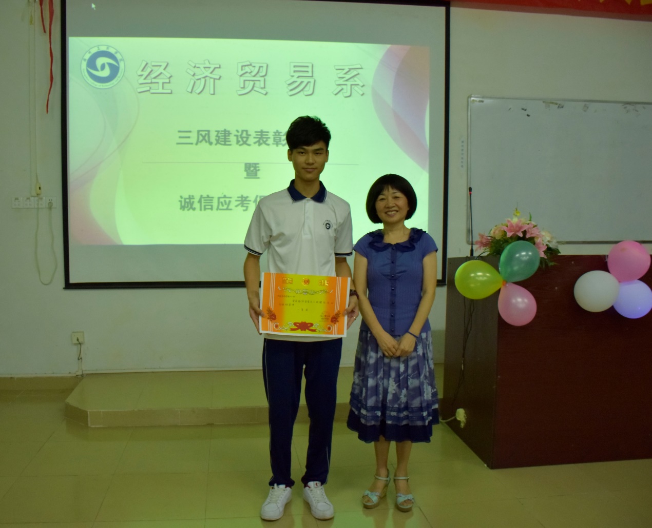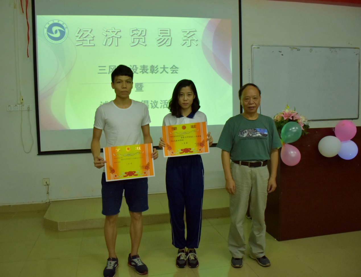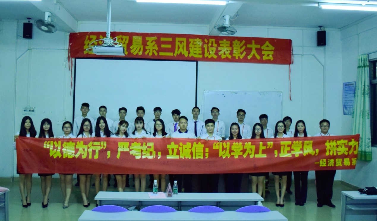 为了实践“以德为行,以学为上”的教育思想,倡导“五进”活动,进一步加强我系的校风、教风、学风建设,提高教育教学和人才培养质量,促进我系良好学风的形成,我系于6月15日晚19:00在经管楼101举办了本学期经贸系三风建设表彰大会暨诚信应考倡议活动。出席本次大会的有经贸系主任易露霞系教授、副主任李习纯副教授、副主任马超平老师、办公室主任黄享政老师和学工组的辅导员以及本学期获得先进班集体和文明宿舍的代表们。