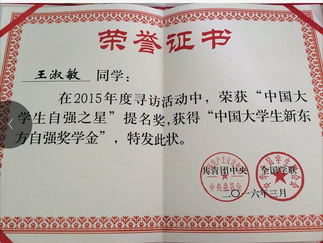 王淑敏同学15年“中国大学生自强之星”荣誉证书