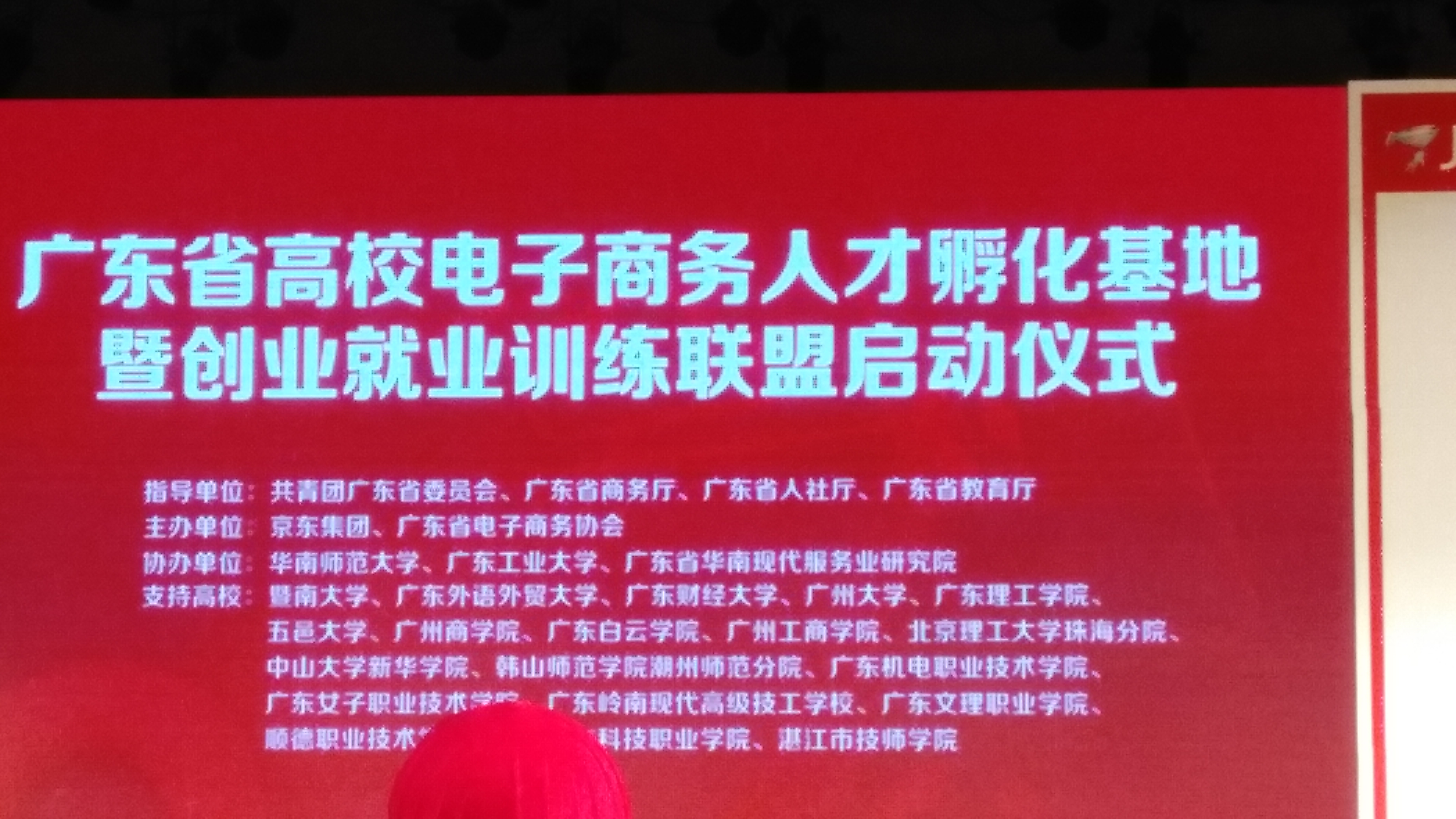 2016年4月15日,“广东省高校电子商务人才孵化基地暨创业就业训练联盟启动仪式”在华南师范大学广州大学城校区正式举行。共青团省委、省商务厅、省人社厅、省教育厅相关领导,京东集团,省电子商务协会,华师、广工等20多所高校代表出席本次启动仪式。