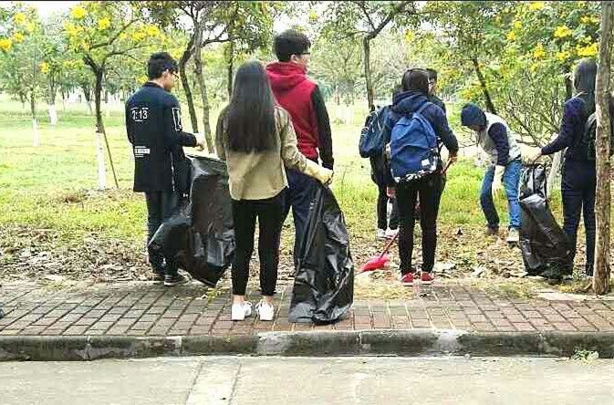 树枝在寒风凛冽中轻微颤动,同学们紧握手中的工具,不畏脏不怕累,分工明确,井井有条,扫起林荫小道上的落叶,踏在草丛上,同学们弯下腰捡起散在各处的垃圾,棕褐色的泥土黏在同学们的鞋子上,他们也一笑而过。忙碌的同学们,就像一个个辛勤的园丁,爱护着这个魅力四射的校园。