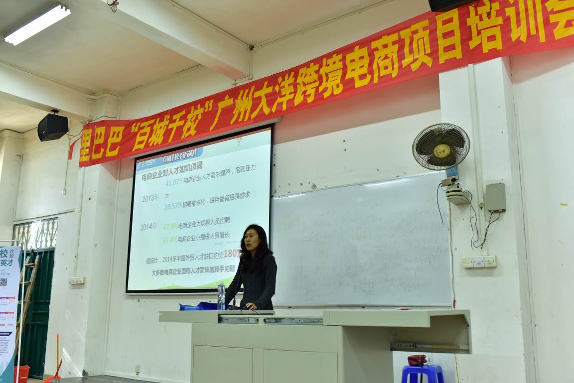 11月26日下午2点20分,以“阿里巴巴跨境电商的应用与学习”为主题的知识讲座在计算机楼105课室开展。本次讲座由广州大洋信息技术股份有限公司的邝智辉讲师主讲,经贸系办公室主任黄享政老师、刘道敬老师出席讲座,14级电商A2、A3、A4、A5班全体同学以及经贸系对阿里巴巴跨境电商感兴趣的同学前往学习。