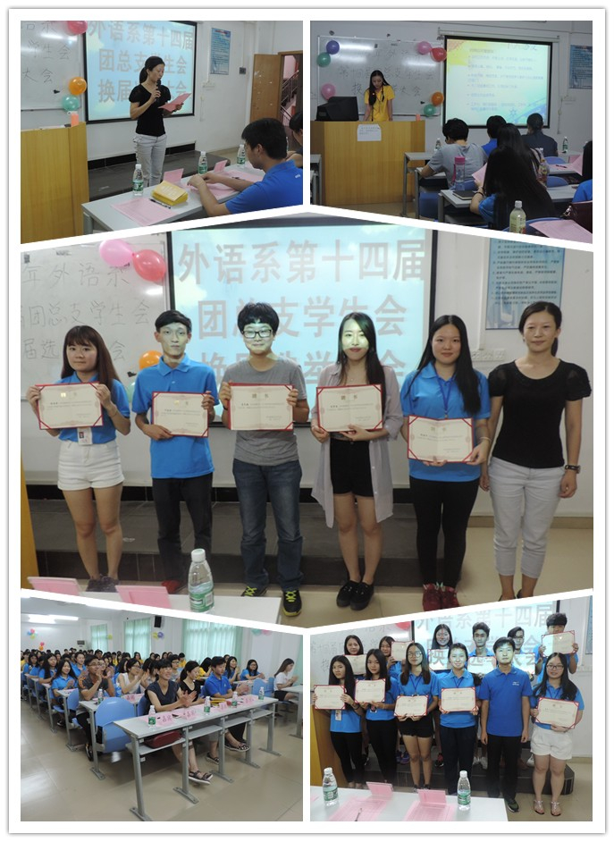外语系2015届学生会换届选举大会于6月18日下午六点在外语楼203举行,出席本次大会的老师有周燕副主任,吴坡光老师,王川坡老师,罗美娥老师,苏伟豪老师,史敏老师以及团学主席蓝冬燕和副书记龙紫苑。