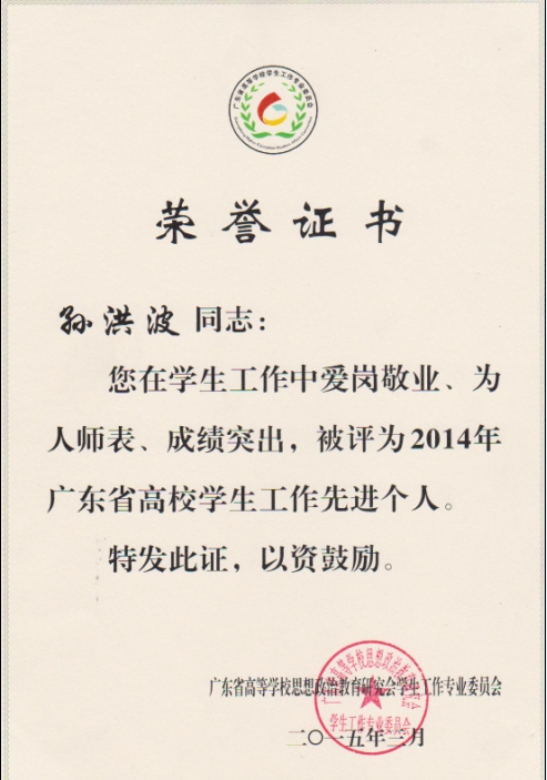 2009-2010学年被学院评为“优秀教职员工”,2011年6月和2012年9月两次被学院党委会评为“优秀共产党员”,在省级期刊和学报发表论文3篇,参加省级和院级课题研究3项。2014年被评为广东省高校学生工作先进个人。