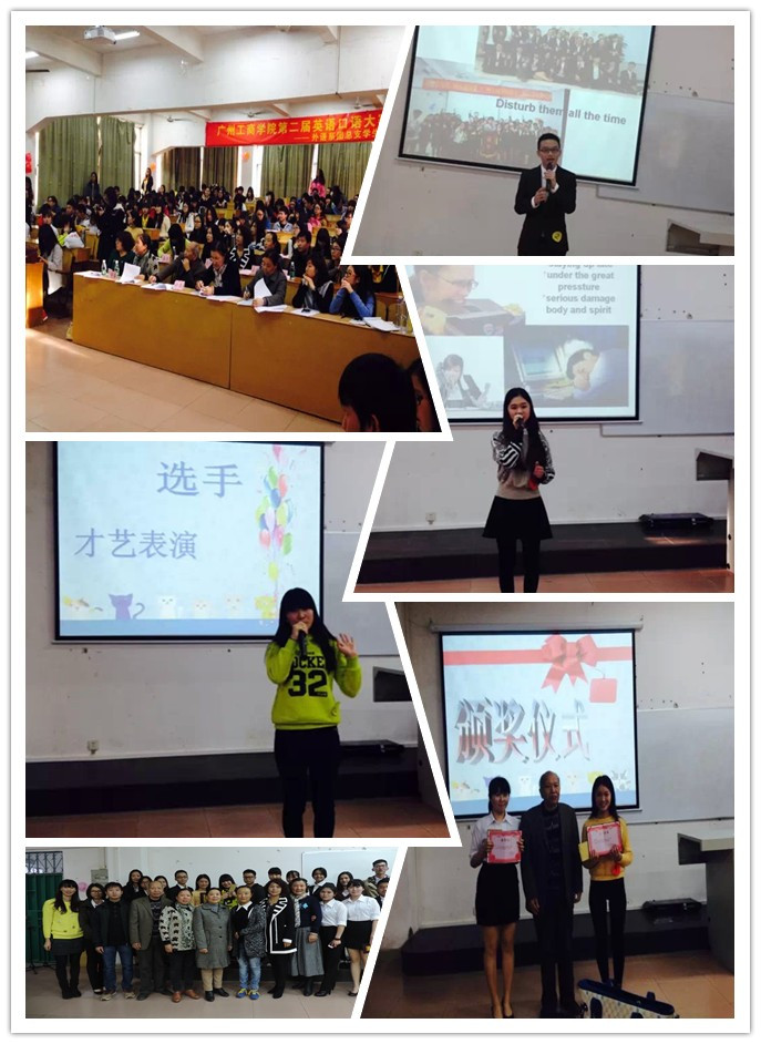 为践行学院“五进”之“进实验实训室”精神,丰富校园文化生活,提高学生的口语水平,2014年12月11日下午2点30分,外语系在花都校区计算机楼105举行学院第二届英语口语大赛决赛。出席本次大赛的评委有:伍志辉教授、廖兰玉副教授、蔡亦姝老师、周正秀老师、陈利萍老师,嘉宾有来自甘南藏族自治州的包慧老师、张霞老师及学工组全体老师。