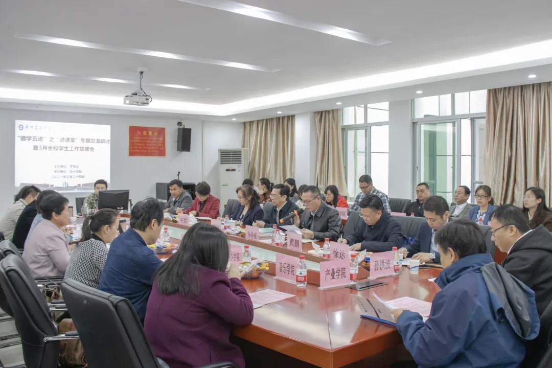 3月24日上午,ky开元“德学五进”之“进课室”专题交流研讨暨3月全校学生工作联席会于三水校区系部楼311会议室召开。本次会议由学生处主办,会计学院承办,会议对“德学五进”之“进课室”新内涵进行深入研讨。校长邝邦洪、副校长朱特威、副校长兼马克思主义学院院长张辉,校长助理兼学生处长黄鹏、教务处长王益玲、学生处副处长徐达、学生处副处长孙洪波、团委书记洪卫烈及学生处各科室中心负责人、各学院主管学生工作负责人、学工办主任,会计学院领导及全体辅导员参加了会议,会议由朱特威副校长和徐达副处长主持。