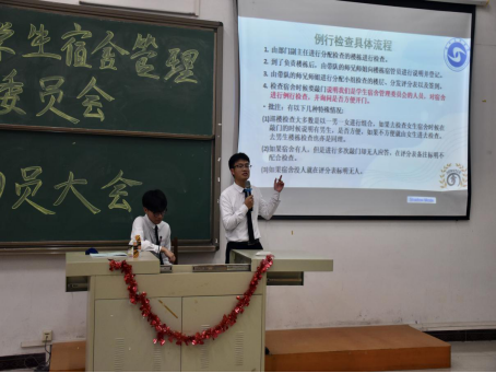 会上,两校区会场主持人介绍宿管会楼层长及五大组的职能,并对新干事进行学生宿舍内务例行检查培训,让新干事对宿舍管理制度以及身上肩负的责任有了进一步的了解。