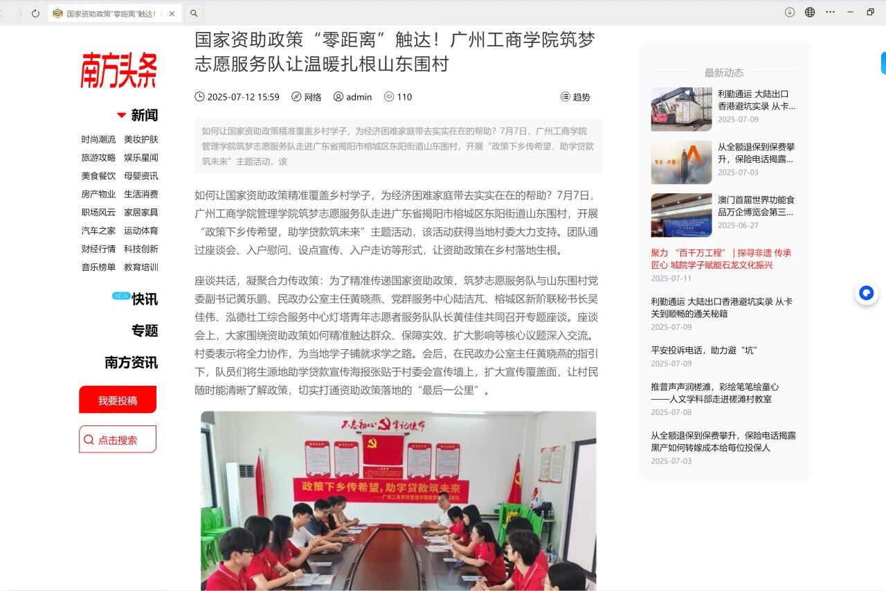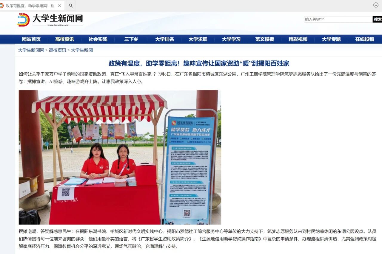 本次“国家资助政策下乡行”活动获得了多方媒体的关注与报道,包括大学生新闻网、南方头条、青年网以及榕城区官方媒体“榕城发布”微信公众号等。各媒体平台聚焦活动开展情况,形成了线上线下联动的传播合力,进一步扩大了国家资助政策的覆盖面和影响力,助力国家资助政策更好地惠及乡村百姓。