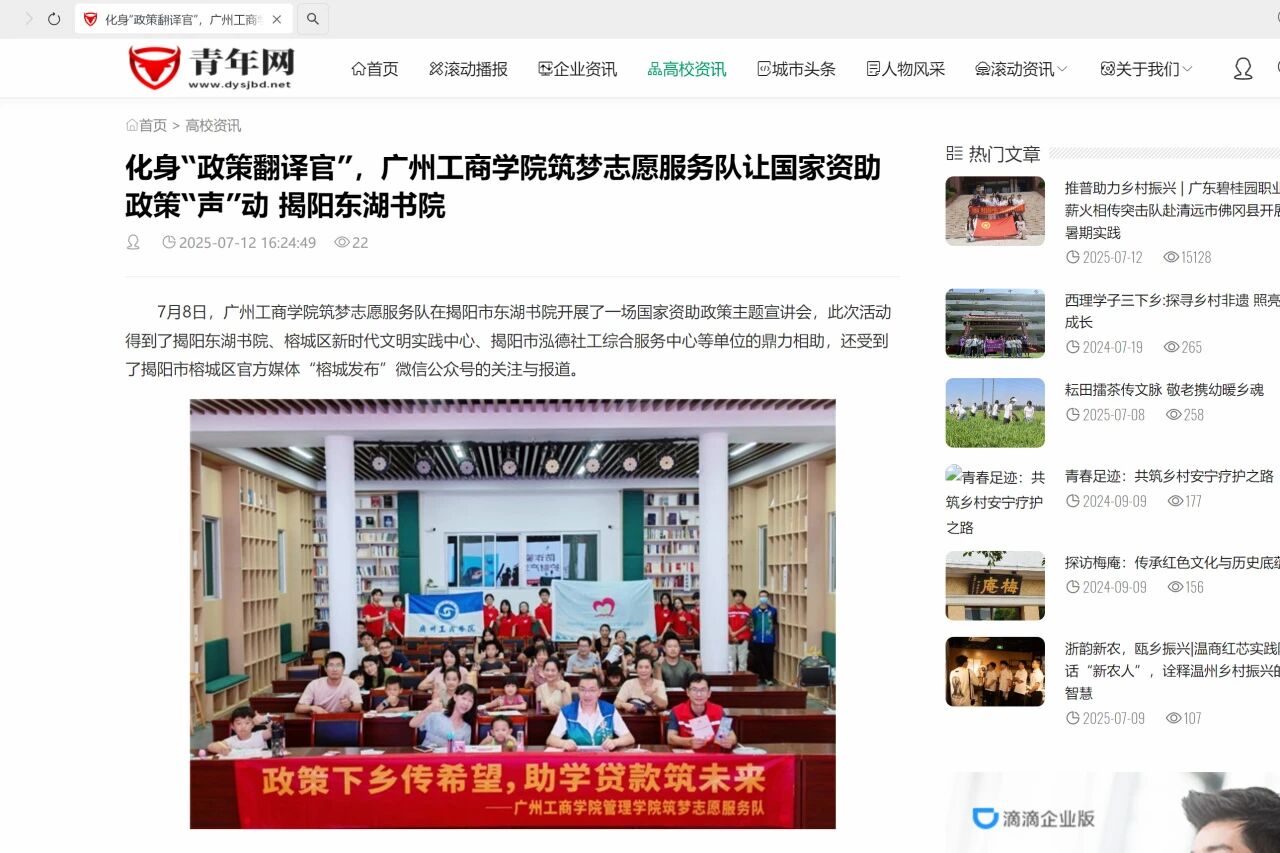 7月8日,在揭阳东湖书院、榕城区新时代文明实践中心、揭阳市泓德社工综合服务中心等单位的大力支持下,筑梦志愿服务队于东湖书院成功举办国家资助政策主题宣讲会。筑梦志愿服务队的队员们化身“政策翻译官”,以贴近生活的真实案例为引,聚焦资助范围、申请流程、还款细则等关键内容,深入浅出地解读广东省学生资助政策与生源地信用助学贷款政策。此外,宣讲会同步开启线上直播,有效打破地域限制,将政策解读与互动内容实时传递至场外观众,确保惠民政策触达更多有需要的家庭。凭借扎实的解读与创新实践,本次活动获得榕城区官方媒体“榕城发布”微信公众号的专题报道,进一步提升了资助政策的覆盖面和影响力。