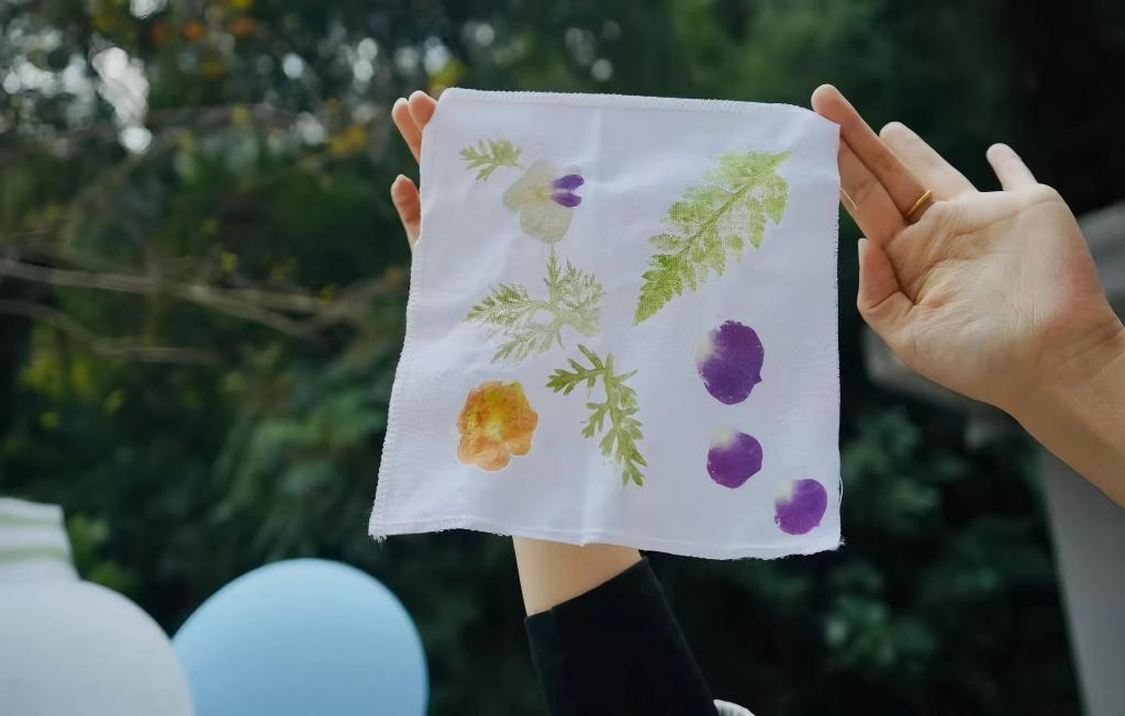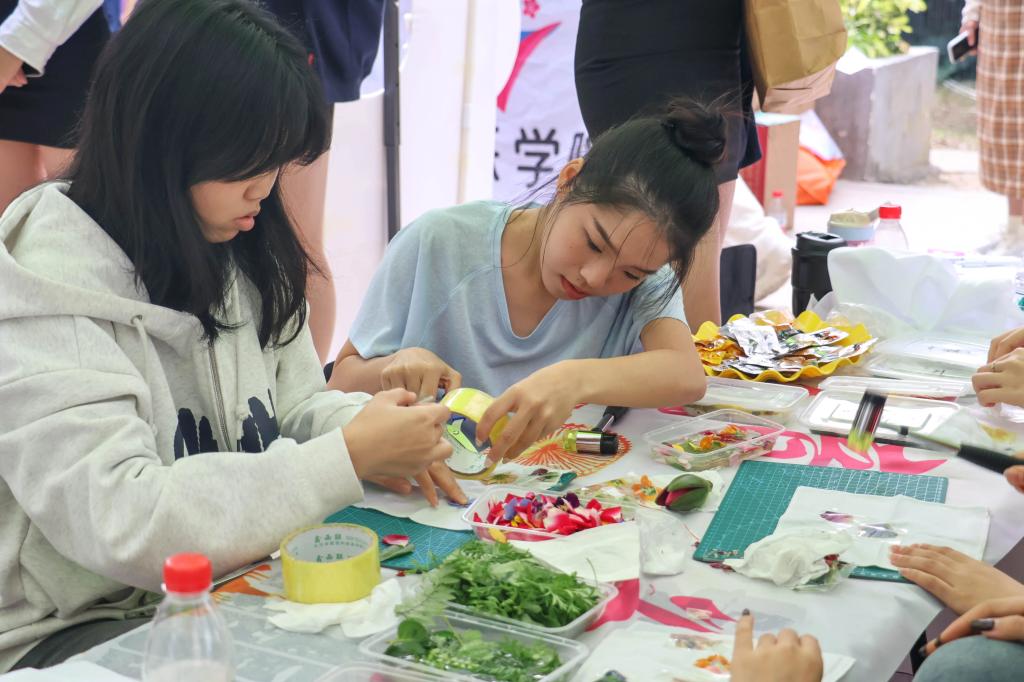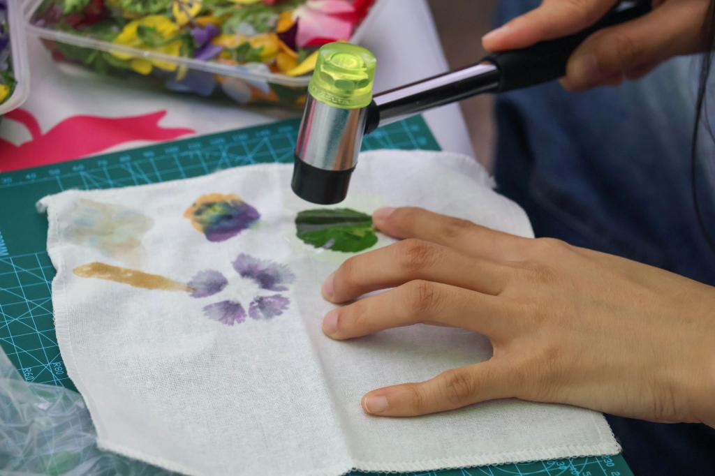 在“音韵草木·染织秋声”音乐节互动活动中同学们在歌声中体验美好,学生利用新鲜花材以及树叶为素材。通过物理敲击的方式,将植物的自然形状、脉络与色彩拓染至布面上,形成独一无二的艺术作品,鼓励学生在过程中感悟生命之美与自然馈赠,不仅能感受手工的植物拓染的魅力,更以“一叶一花”传递着爱与希望的力量。