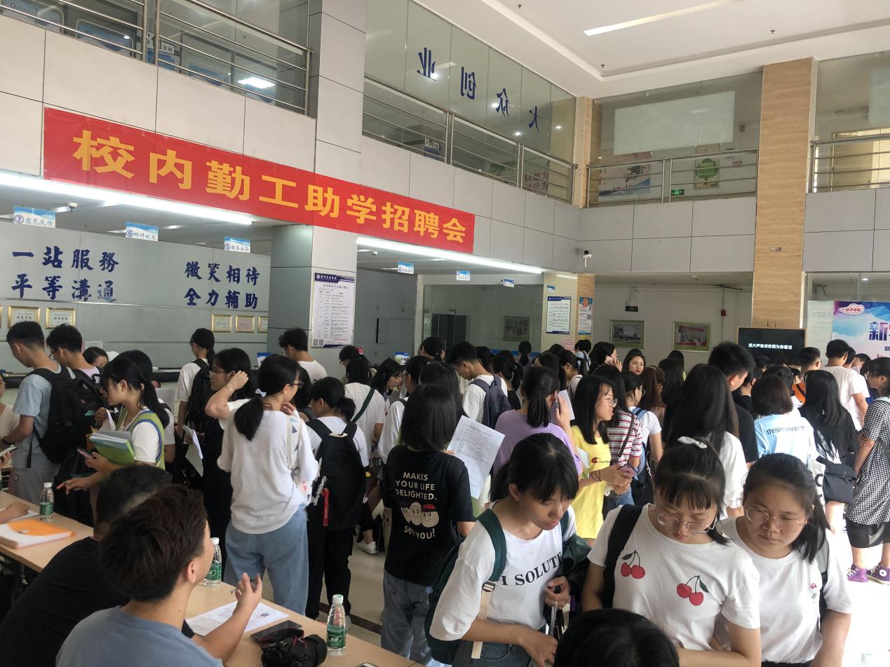 为了培养学生的自立自强精神和树立竞争上岗意识,学生资助管理中心于9月11日中午在一站式服务中心(三水校区)和教学楼大厅(花都校区)分别举办了2019-2020年第一学期校内勤工助学岗位招聘会。