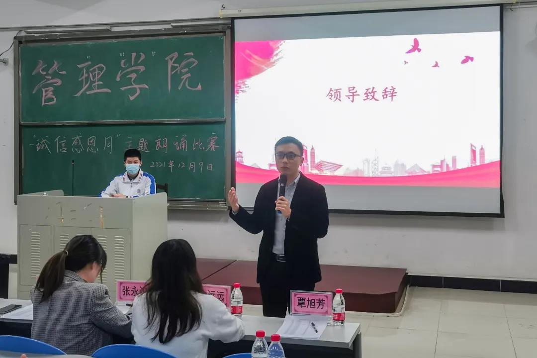 【本网讯】为响应学校“德学五进”的号召,弘扬中华民族的传统美德,全面提升学生的思想素质,扎实展开德学教育,管理学院于12月9日晚19:00,在一实C107举办了“诚信感恩,励志青春”主题朗诵比赛。出席朗诵比赛的嘉宾有管理学院副院长邹剑峰副教授,管理学院学工办主任谭一酉老师,管理学院学工办副主任张永训老师,管理学院学工办副主任余远远老师,管理学院学生第四党支部宣传委员覃旭芳老师,管理学院学生第四党支部组织委员高凤相老师。
