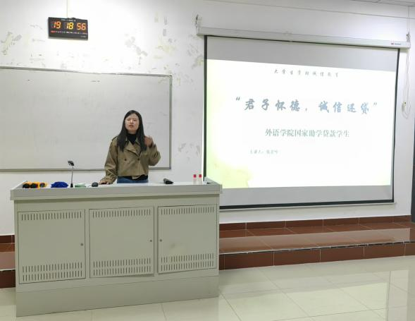 为提高大学生对国家助学贷款政策的认知,增强学生的信用意识和倡导诚信为本的价值观,外语学院于12月11日19点在教学楼417开展“君子怀德,诚信还贷”讲座。本次讲座由外语学院资助经办人钱宏叶老师主持,外语学院生源地贷款大四学生参与。