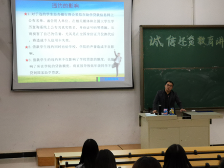 两位老师详细的给大家介绍支付宝还款的方法,从诚信还贷的重要性、大学生应该树立诚信意识的意义、要积极履行还贷义务等方面做了重点介绍,使学生们更好的了解了国家助学贷款的目标、意义、现状和要求。