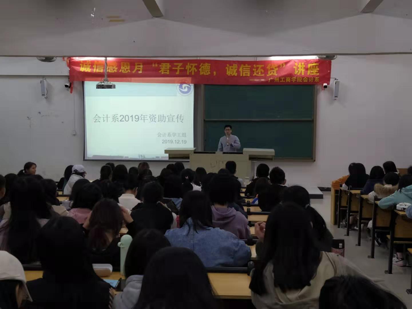 12月19日晚上,会计系在一教C102举行了“君子怀德,诚信还贷”讲座。此次讲座是为了向受资助新生普及国家资助的相关知识,同时讲解支付宝还款方法,引导学生还本付息,树立牢固的诚信意识,明确自身的还贷责任。本次讲座由会计系学工组副组长黄国威老师主讲。