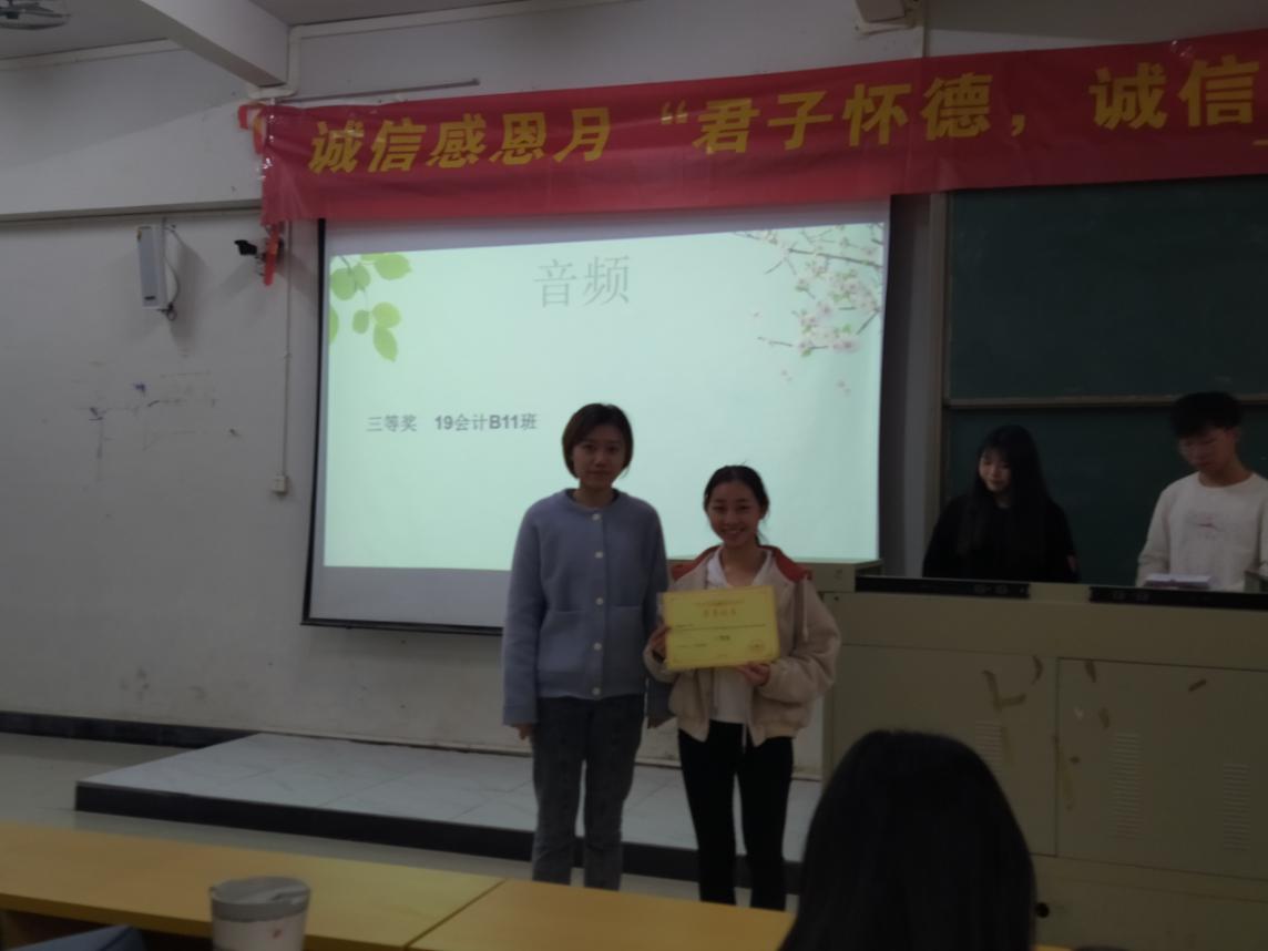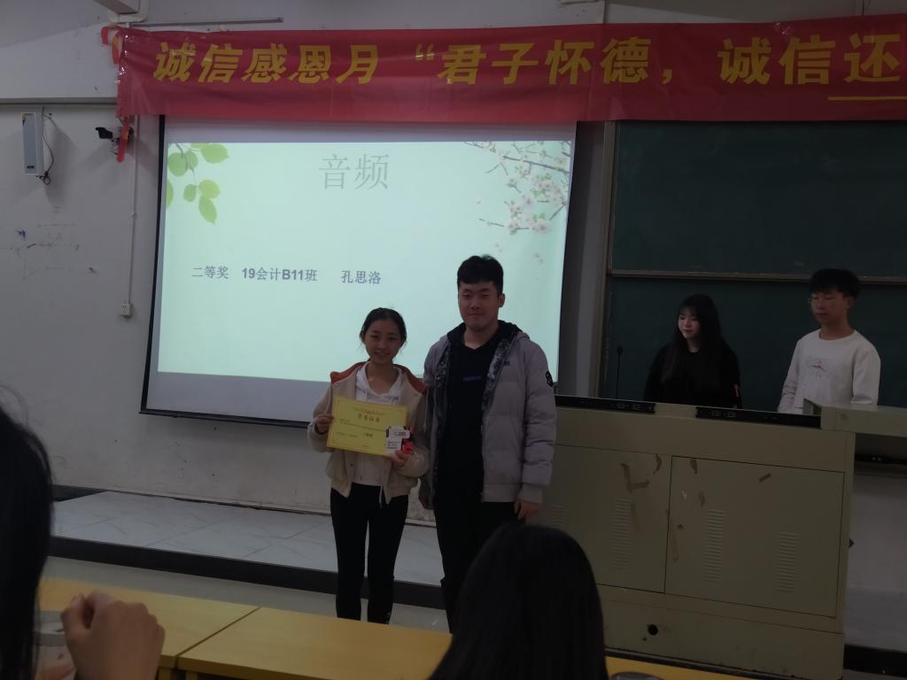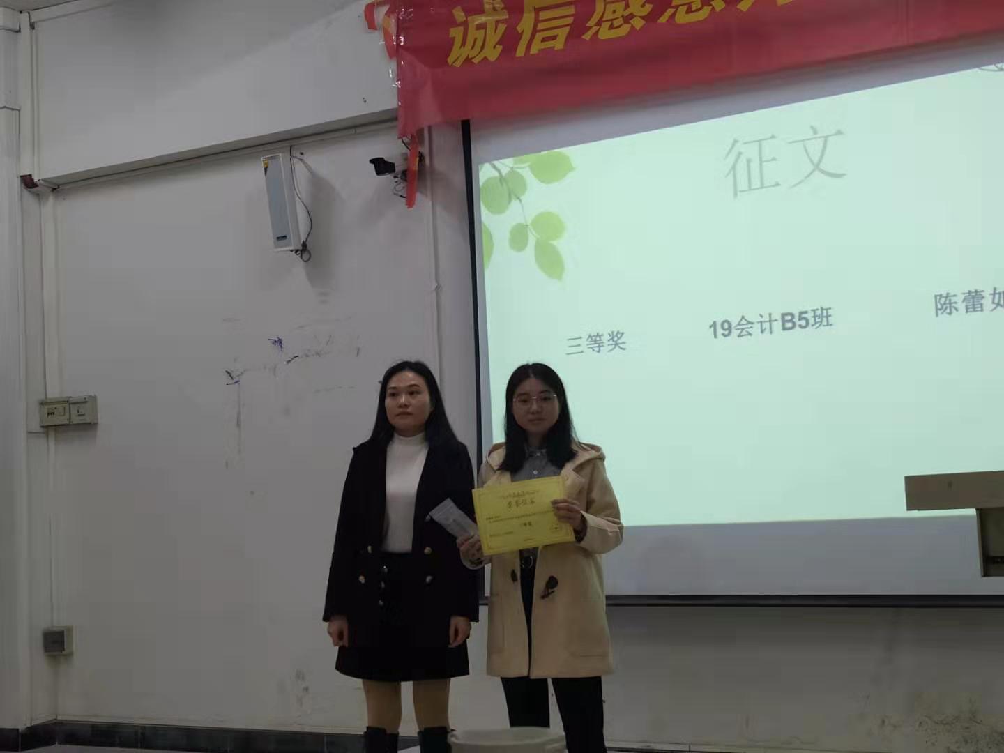 十二月是我院的诚信感恩月。为引导家庭经济困难学生树立“滴水之恩,涌泉相报”的感恩观念,锻炼勤奋学习、自强不息的品质,会计系学工组于12月2日至19日举行了“诚信感恩,励志青春”为主题的系列活动,并于12月19日在一教C102对该活动的获奖人员进行了颁奖。