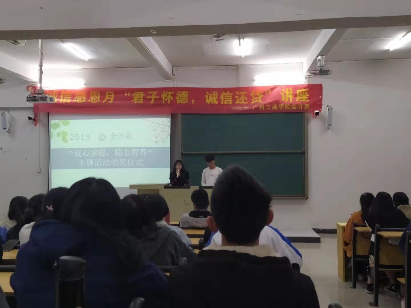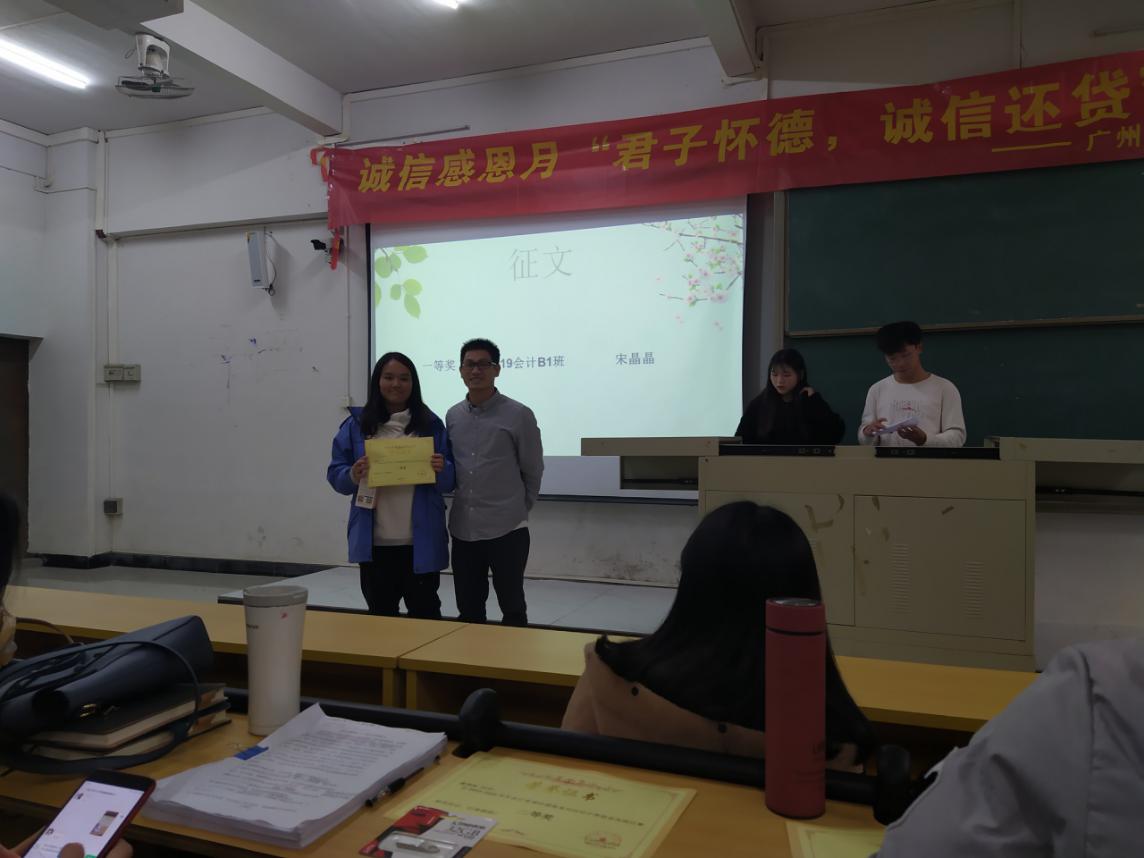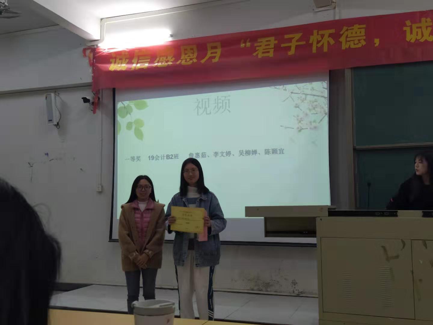 十二月是我院的诚信感恩月。为引导家庭经济困难学生树立“滴水之恩,涌泉相报”的感恩观念,锻炼勤奋学习、自强不息的品质,会计系学工组于12月2日至19日举行了“诚信感恩,励志青春”为主题的系列活动,并于12月19日在一教C102对该活动的获奖人员进行了颁奖。