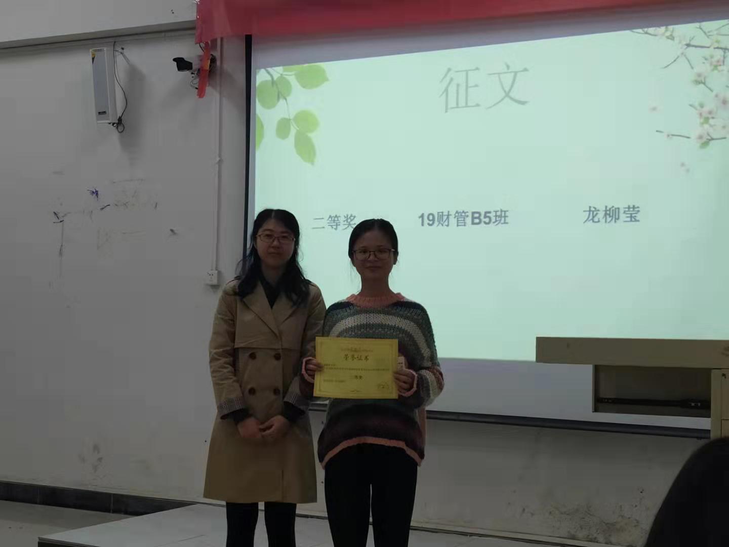 接着颁发的是获得征文比赛名单。获奖人员是会计B1班宋晶晶、会计B8班廖文文、财务管理B5班施惠悦同学。
