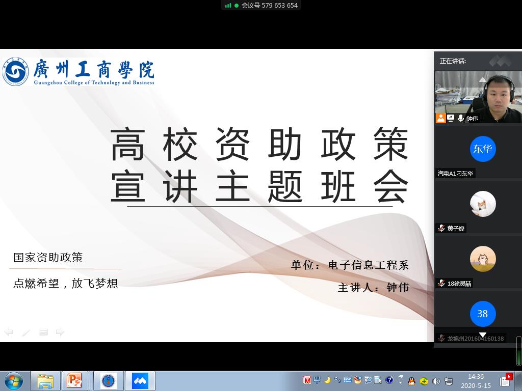 2020年5月21日下午19:00—21:00,由电子信息工程系学工组长钟伟老师和各年级班主任通过腾讯会议为困难生开了一场别开生面的线上资助宣讲会议,并且邀请了17级吴思艺同学、16级赖来辉同学为学弟、学妹们进行了经验之谈。