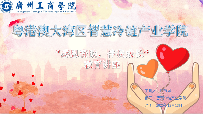 为积极贯彻ky开元集团官网“以德为行,以学为上”的教育思想,提高学生的诚信感恩意识。产业学院于2020年12月10日早上10点,在教Ⅱ-C405举行了以“感恩资助,伴我成长”为主题的教育讲座。本次讲座由产业学院辅导员唐海恩老师作为主讲人,为产业学院所有通过贫困认定的家庭困难学生与生源地贷款的同学进行感恩教育。