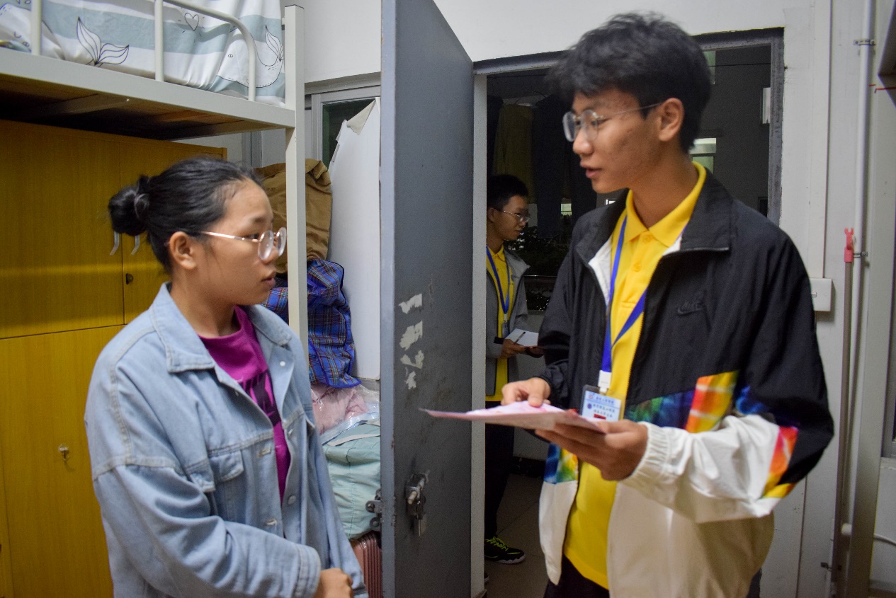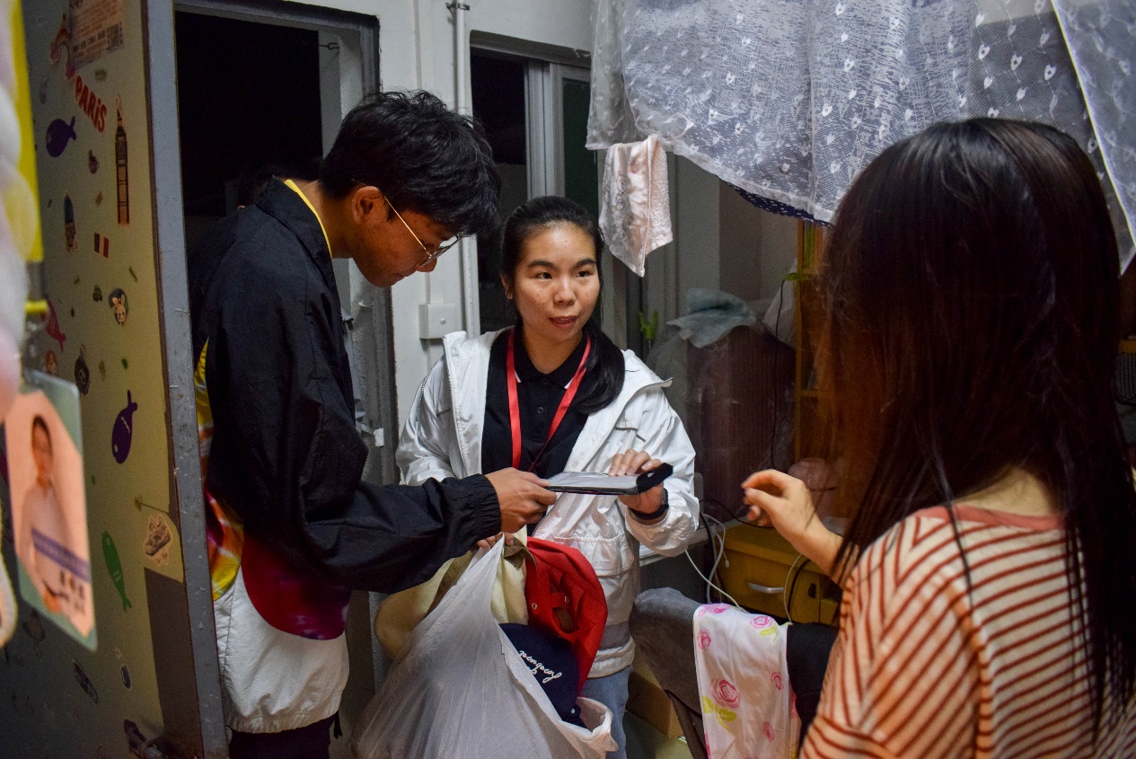 12月8日,我系学生干部带领贫困生在学生宿舍进行“爱心义卖”活动的推广以及对学生捐赠的闲置物品进行回收登记。