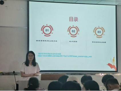 首先,辅导员余柚朴老师向同学们介绍了国家资助政策的主要内容,分别为国家奖助学金、国家助学贷款、广东省家庭经济困难大学新生资助、广东省少数民族聚居区少数民族大学生资助、南粤扶残助学工程、学费补偿和国家助学贷款代偿、绿色通道、勤工助学、学费减免、建档立卡学生免学费和生活费补助等几类。随后对几项内容进行了详细的解说。介绍了国家奖学金和国家励志奖学金的申请条件以及发放方式,并系统的讲述了生源地助学贷款及还款的相关流程。使同学们了解了如何申请国家资助,以及其所需要的条件。同时,也提出学校有勤工助学的机会,能够使学生在学校的组织下,利用课余时间,通过自己的劳动,取得合法报酬。