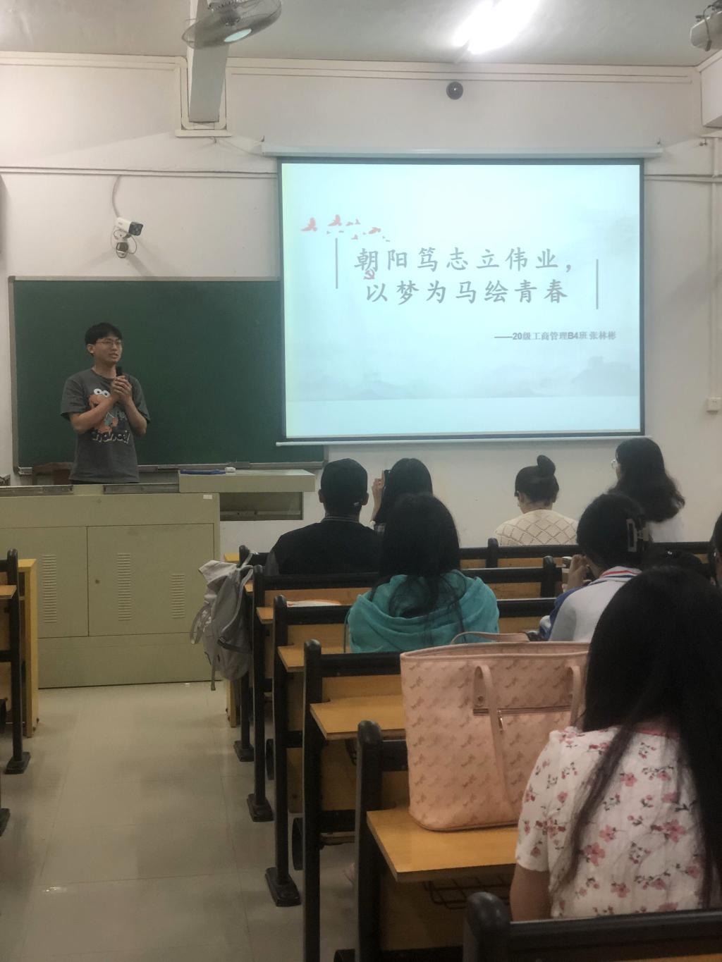 分享会上,张林彬同学以“朝阳笃志立伟业,以梦为马绘青春”为题,以“立志”“坚持”为关键词展开分享,真诚地向同学们表达了他的求学理念。要申请国家奖学金,较好的学习成绩和科研水平是不可或缺的能力要求,因此,张林彬同学着重跟大家分享了自己学习和科研的经验,同时提醒和强调,求学之道在于不断探索,不耻下问。一个好的导师对大学生的影响是巨大的,因此,他鼓励同学们在大学期间寻找一位学业导师并虚心请教,实实在在地做学问,学习导师的渊博知识,找准自己的人生方向。