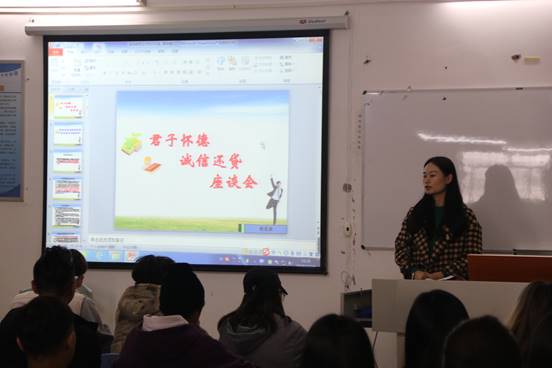 下午14点20分,讲座拉开了序幕。周莉老师向同学们阐述了贷款知识、支付宝还款方法,引导学生按时还本付息,树立牢固的诚信意识,明确自己的还贷责任,助学贷款还款的流程和注意事项。其间,周莉老师从助学贷款还款知识讲解开始,围绕国家助学贷款的由来、申请条件、如何进行还款和展期、以及银行征信系统、信用记录等政策和措施等方面做详细介绍。她告诉我们:信用,不仅反映在助学贷款问题上,它还存在于日常工作、学习和生活之中。未来对信用的需要更会无处不在。因为它不仅需要你对周围的人和事负责,更是社会对你的一种评价标准。贷款学生代表发言,现场互动,学生就还款常见问题进行提问,在周莉老师的解说下做通过案例介绍了拒绝还款的危害,呼吁同学们应抱有一颗感恩之心,诚信做人,诚信还贷,不要逾期或拒绝还款,要用优异的成绩和良好的信誉回报社会。